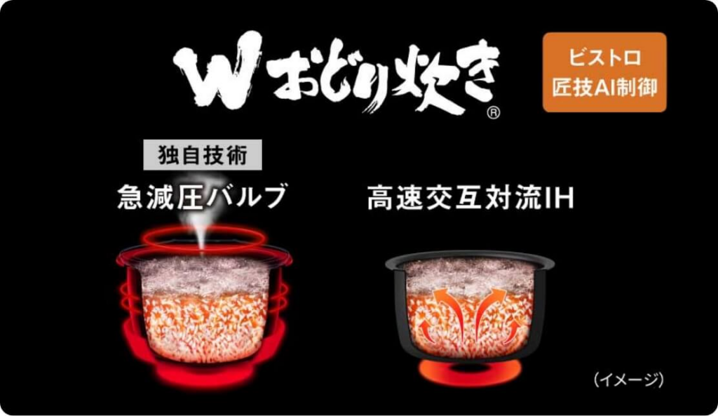 パナソニック独自の「Wおどり炊き」技術は、かまど炊きの美味しさを科学的に再現したものです。「急減圧バルブ」による爆発的な沸騰と、IHヒーターによる「高速交互対流」を組み合わせることで、釜の中のお米を激しく「おどらせ」ます。